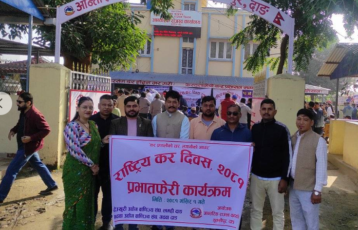 आधुनिक एवम् वैज्ञानिक कर प्रणालीतर्फको प्रस्थान विन्दुका रूपमा नेपालमा मूल्य अभिवृद्धि कर लागु भएको दिनको स्मरण गर्दै हरेक वर्ष मङ्सिर १ गते राष्ट्रिय कर दिवस मनाउने गरिन्छ । यसैबिच आन्तरिक राजस्व कार्यालय तुलसीपुर दाङको आयोजनामा तुलसीपुरमा कर सप्ताह कार्यक्रम अन्तर्गत तुलसीपुरमा प्रभातफेरी कार्यक्रम सम्पन्न भएको छ । कार्यक्रममा दाङ उद्योग वाणिज्य संघ, तुलसीपुर उद्योग वाणिज्य संघ सहित राष्ट्रसेवक कर्मचारी, व्यवसायी, लेखापरीक्षक संघ, विद्यार्थीलगायतको सहभागिता रहेको थियो ।