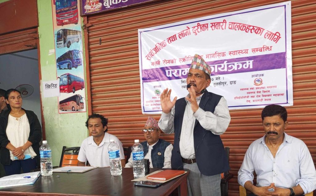 स्वास्थ्य तथा जनसङ्ख्या मन्त्रालय स्वास्थ्य सेवा विभाग इपिडियोलोजी तथा रोग नियन्त्रण महाशाखा टेकु काठमाडौंको आयोजना तथा तुलसीपुर उपमहानगरपालिकाको समन्वयमा भएको कार्यक्रममा नसर्ने रोगको स्क्रीनिङ गरिएको थियो । तुलसीपुर उपमहानगरपालिका नगर प्रमुख टीकाराम खड्काको अध्यक्षता तथा जिल्ला समन्वय समिति दाङका प्रमुख नित्यानन्द शर्माको प्रमुख आतिथ्यतामा भएको कार्यक्रममा प्रमुख शर्माले चालकको स्वास्थ्य अवस्था जाँचका लागि कार्यक्रम आयोजना गरिएकोमा धन्यवाद दिए ।
