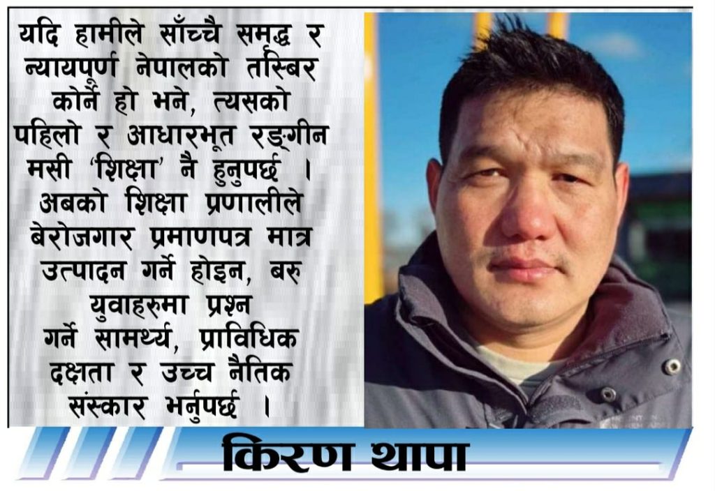 यदि हामीले साँच्चै समृद्ध र न्यायपूर्ण नेपालको तस्बिर कोर्ने हो भने, त्यसको पहिलो र आधारभूत रङ्गीन मसी ’शिक्षा’ नै हुनुपर्छ । अबको शिक्षा प्रणालीले बेरोजगार प्रमाणपत्र मात्र उत्पादन गर्ने होइन, बरु युवाहरुमा प्रश्न गर्ने सामथ्र्य, प्राविधिक दक्षता र उच्च नैतिक संस्कार भर्नुपर्छ ।